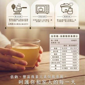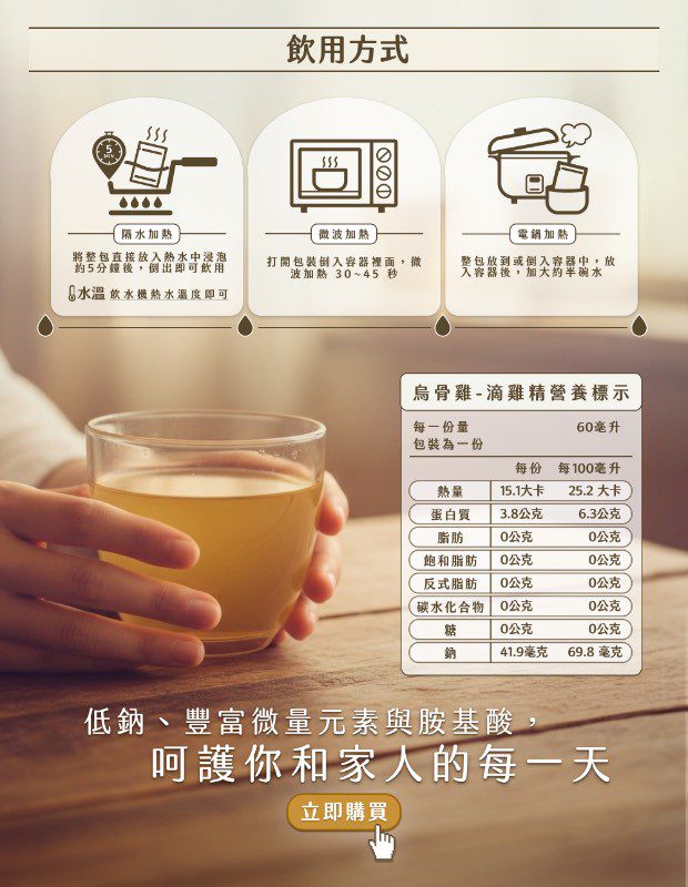 🌟遵循古早阿嬤傳承製程,堅持 12小時滴製,過程不加任何一滴水,純正精華滴滴濃醇,一隻雞僅能淬取出 2~3 包,製作過程中去油脂、零膽固醇,是溫補最好的補品唷!烏骨滴雞精口感清爽,富含18種微量元素及礦物質,能溫和調理體質、幫助身體虛弱者補充營養~